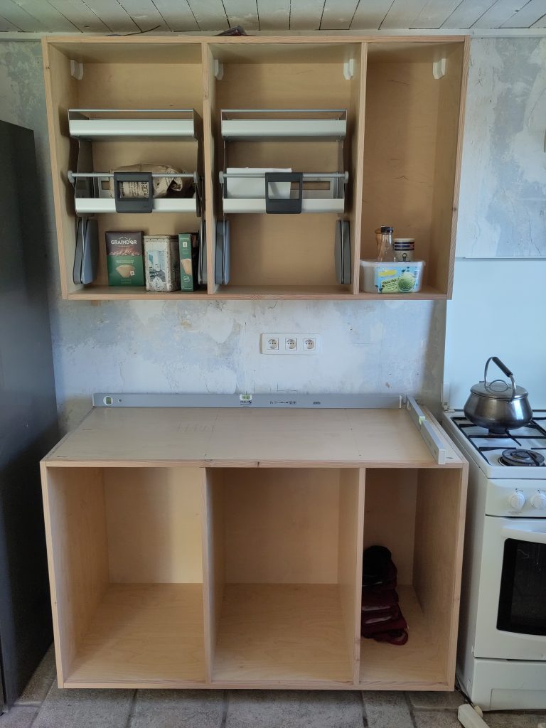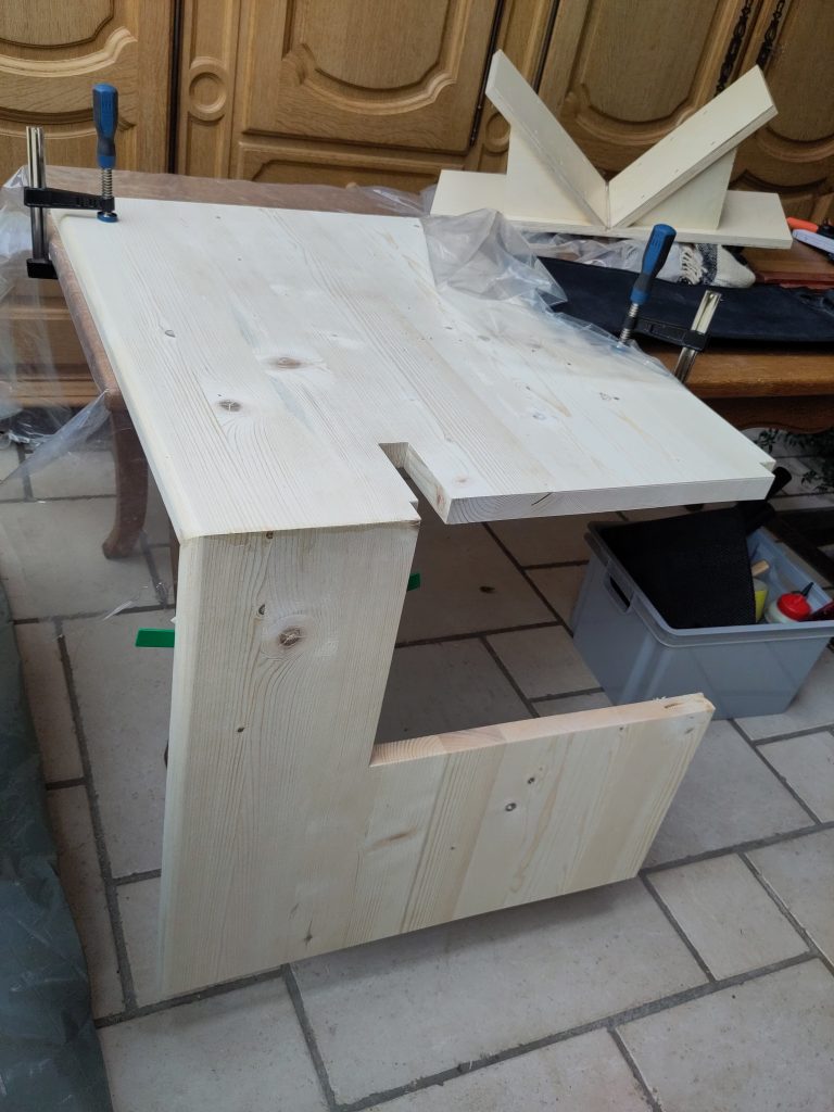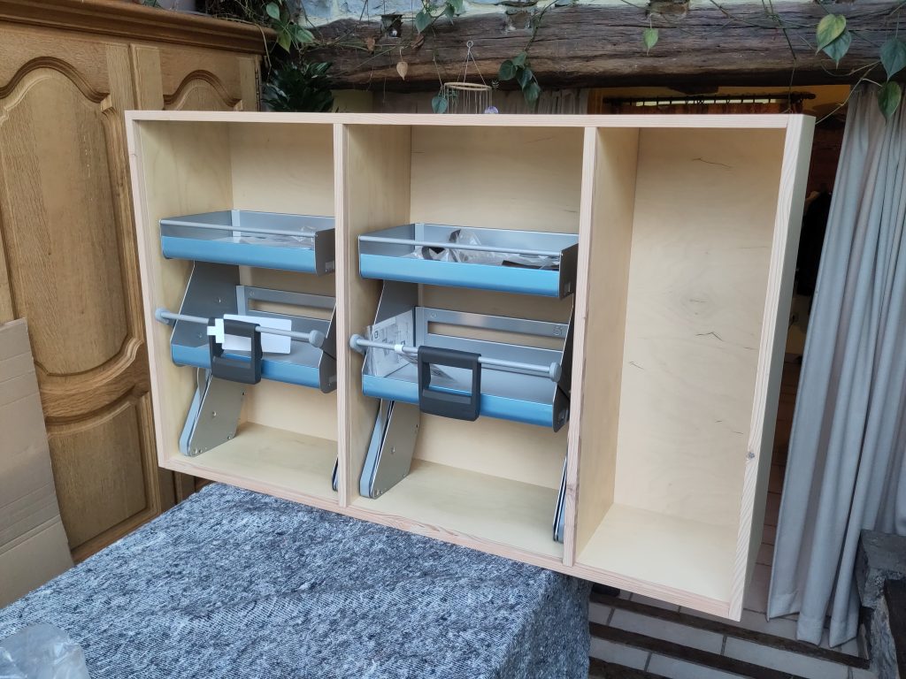 J’ai commencé par le meuble haut avec les étagères iMove. Comme pour le premier meuble, on reste avec du contreplaqué/multiplex bouleau pour la structure et des parties visibles en douglas massif.