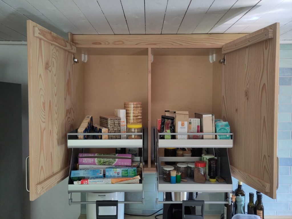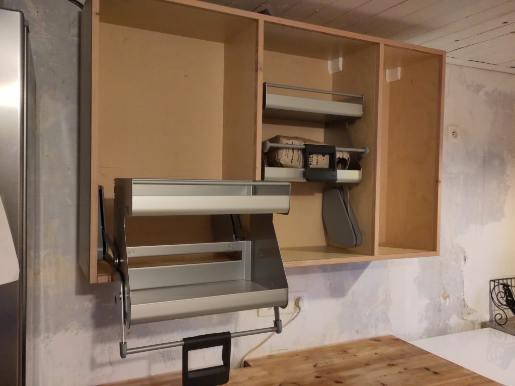 La deuxième partie de la cuisine est donc constituée d’un meuble bas avec sept tiroirs et un grand plan de travail. Il y aura un meuble haut avec des étagères mobiles qui descendent pour rendre l’accès aux denrées facile. Sur la droite, il y aura un plan de travail également qui encadrera le lave-vaisselle.
