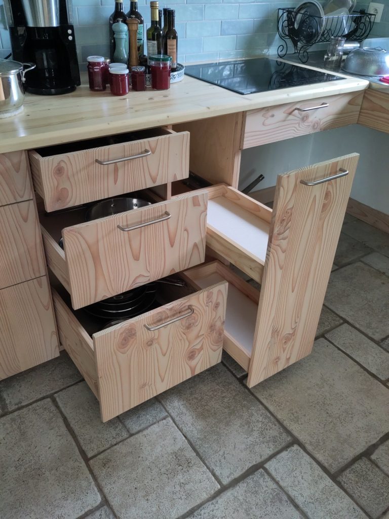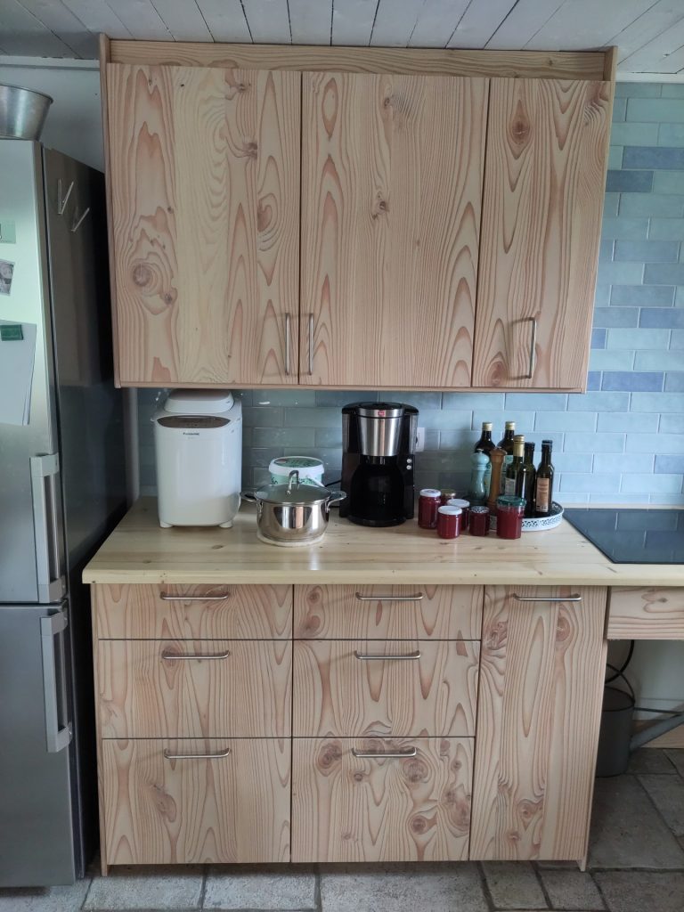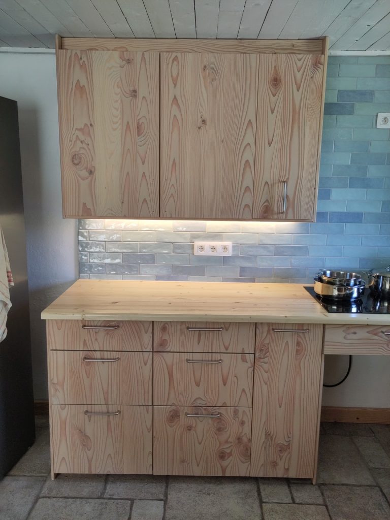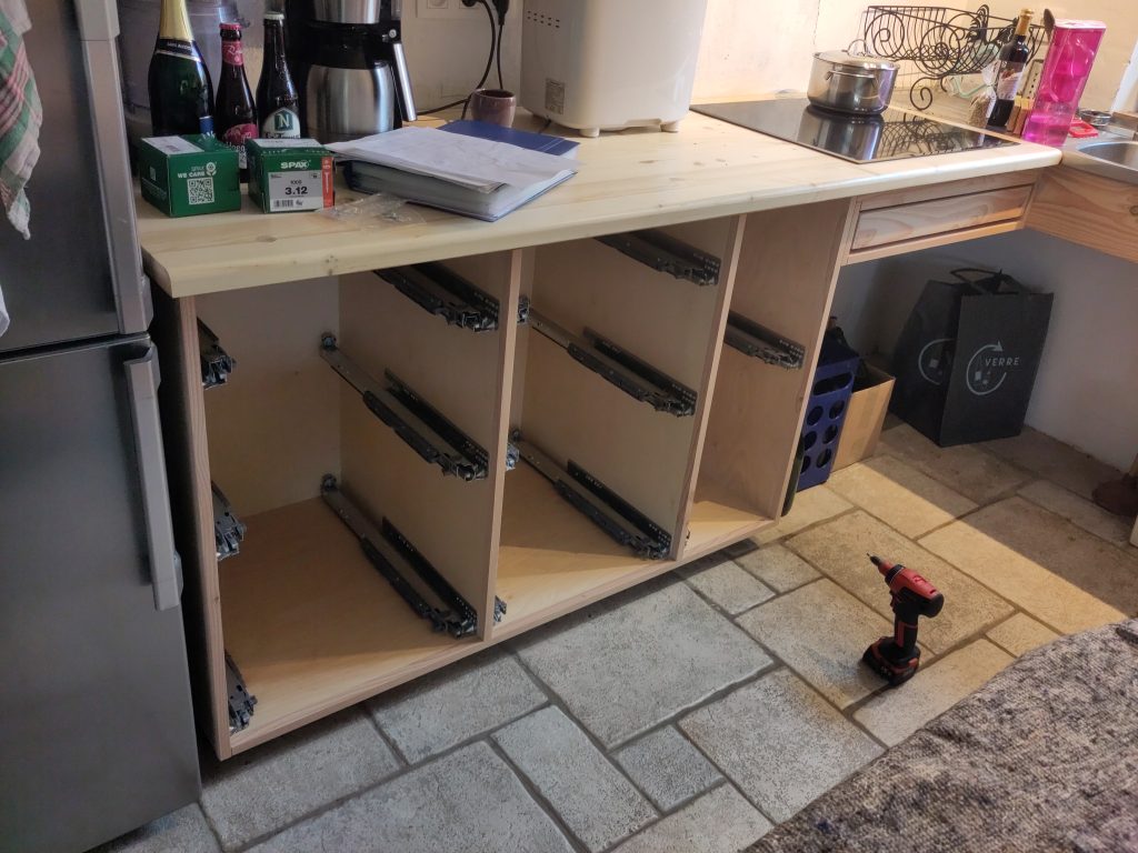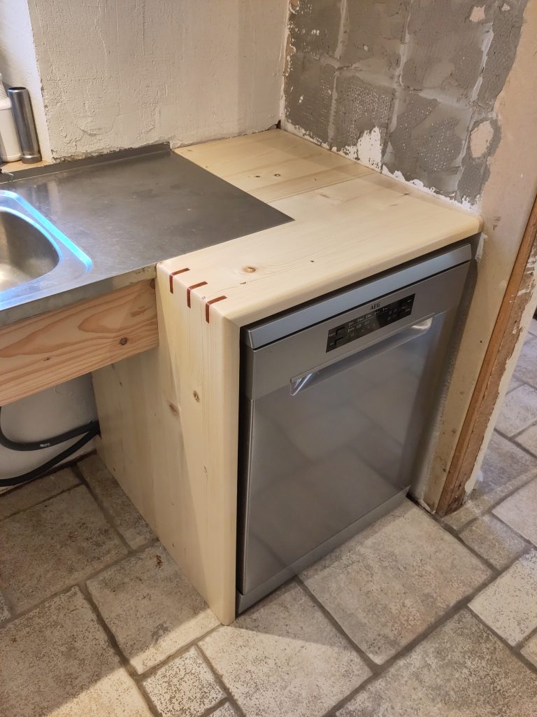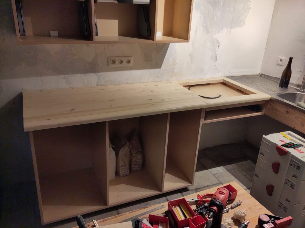 Le plan de travail est en sapin, pour contraster un peu avec le douglas. La partie avec la taque au dessus du meuble n’a posé aucune difficulté. Je me sens par contre bien amusé sur la partie droite… Voici tout d’abord quelques photos de la première partie :