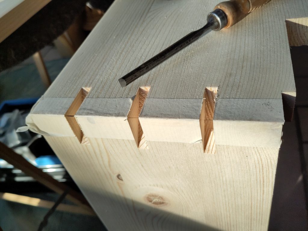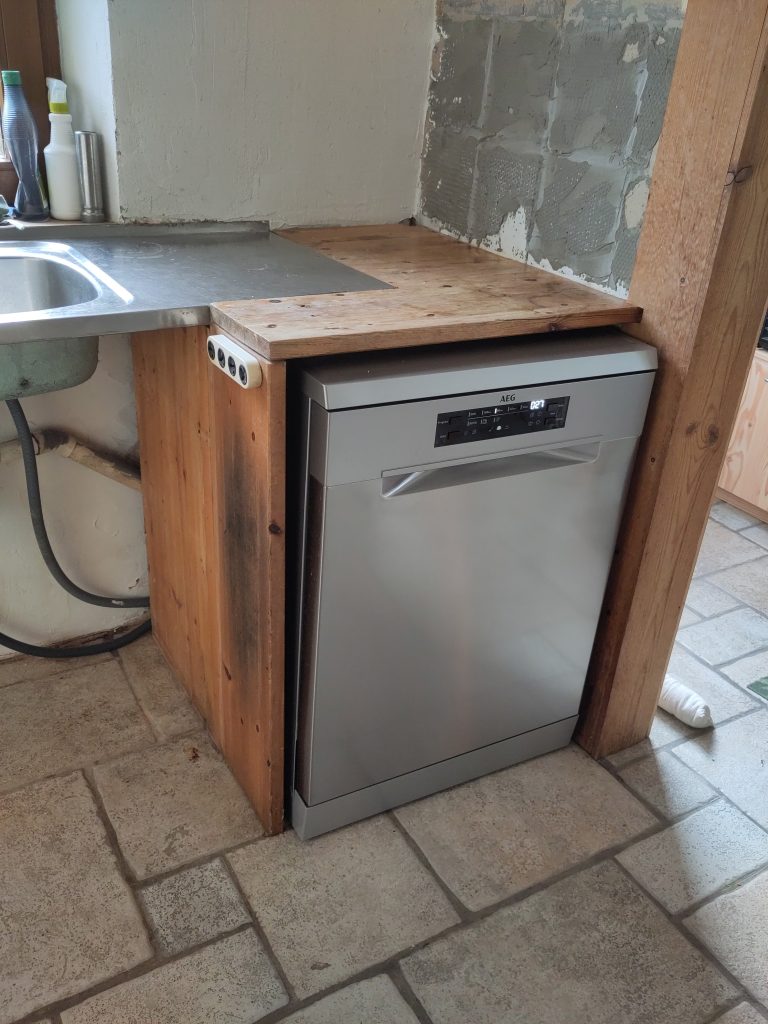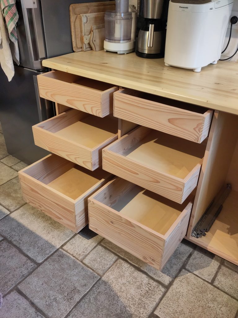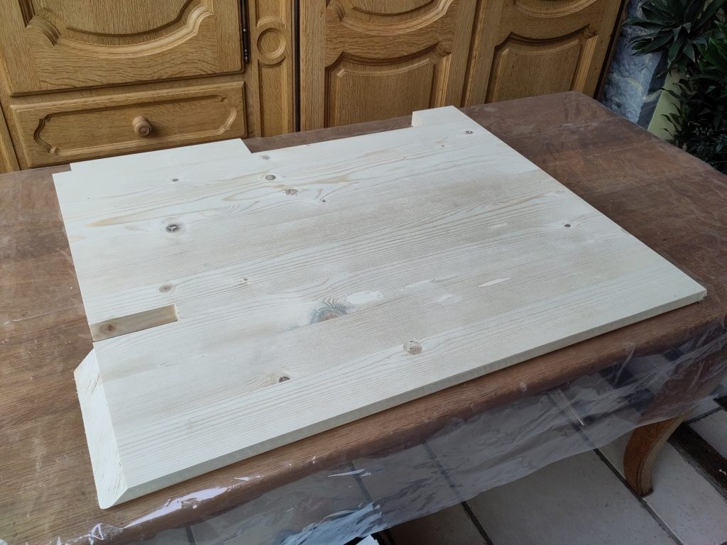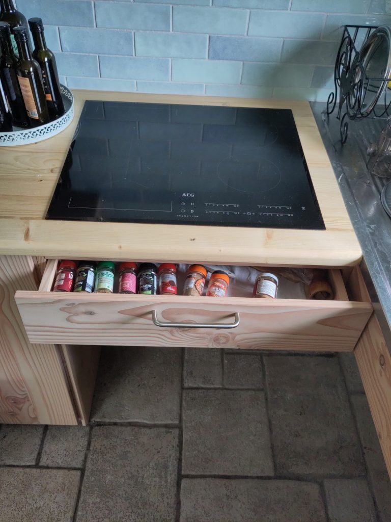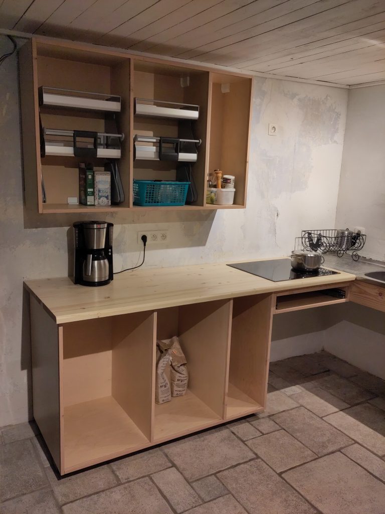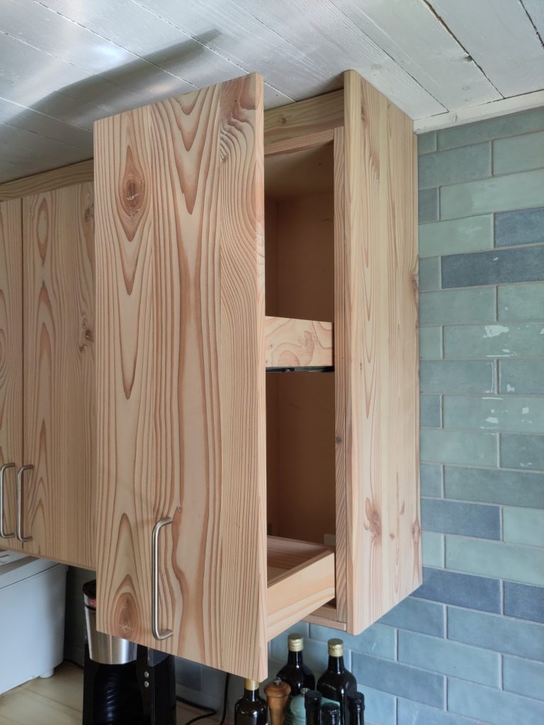 Le plan de travail est en sapin, pour contraster un peu avec le douglas. La partie avec la taque au dessus du meuble n’a posé aucune difficulté. Je me sens par contre bien amusé sur la partie droite… Voici tout d’abord quelques photos de la première partie :