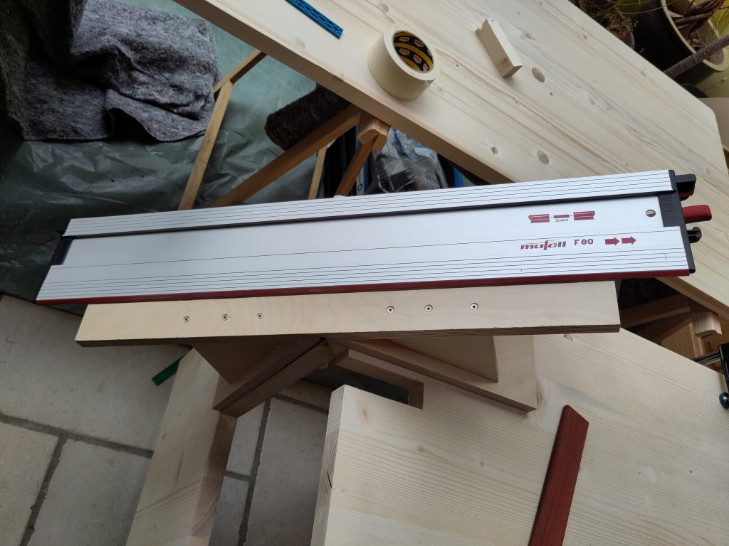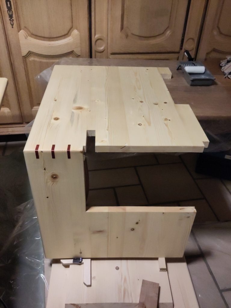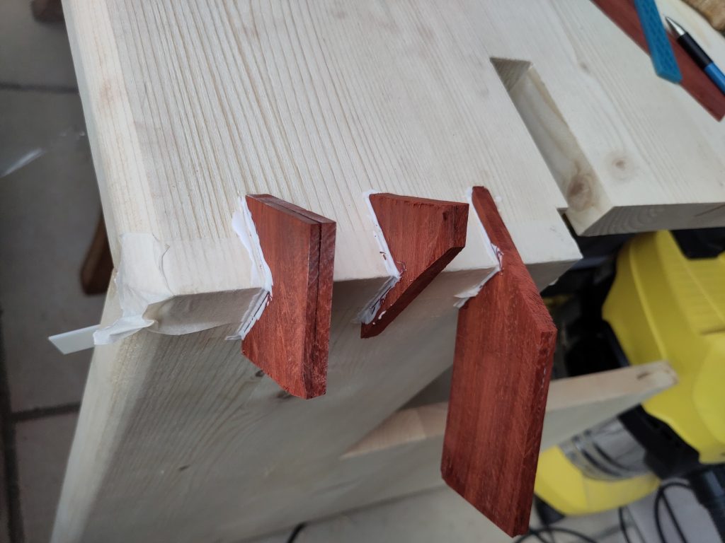 J’ai donc décidé de faire un raccord en onglet pour le plan de travail. Et comme l’onglet est assez court par rapport aux dimensions du plan de travail, j’ai choisi de faire des renforts en padouk (chutes récupérées d’un chantier terrasse en sous-traitance).
