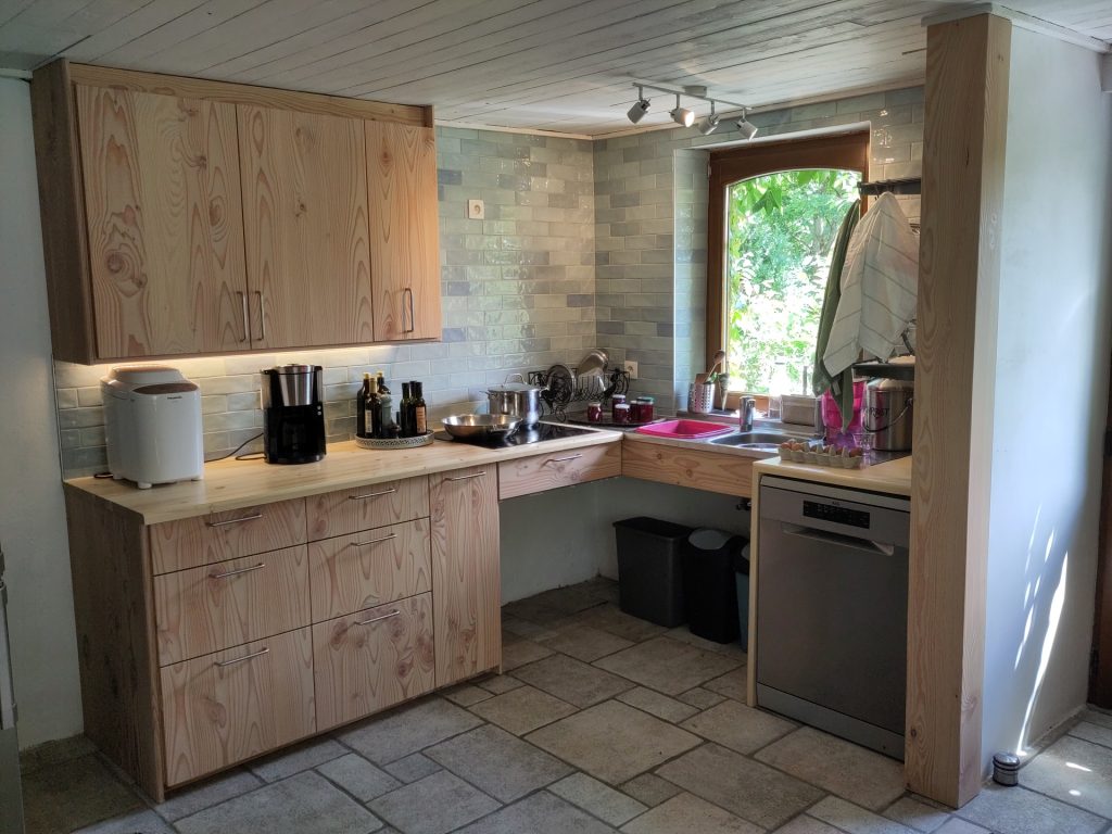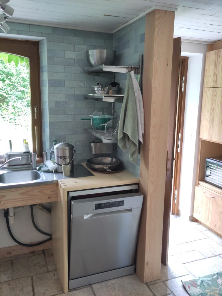 Les plans de travail ont reçu trois couches de vernis de chez Blanchon. C’est un vernis très agréable à appliquer et très résistant. Après mon passage, les murs ont été carrelés pour terminer la cuisine. Voici une vue avec les leds sous le meuble haut allumées.
